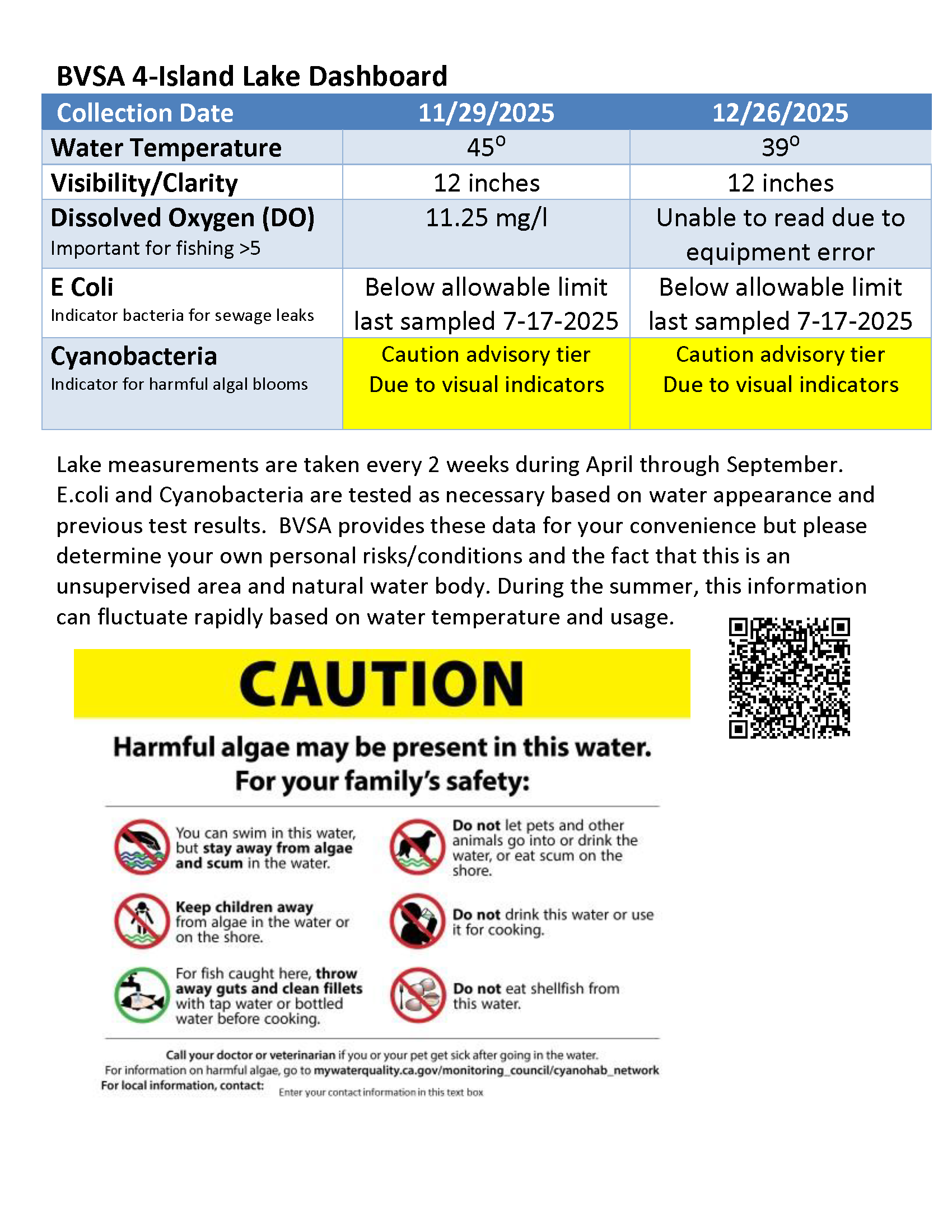 The LQAC regularly checks the water at Four Island Lake for cyanobacteria and related toxins. Findings are reported to the BVSA and the State of California.